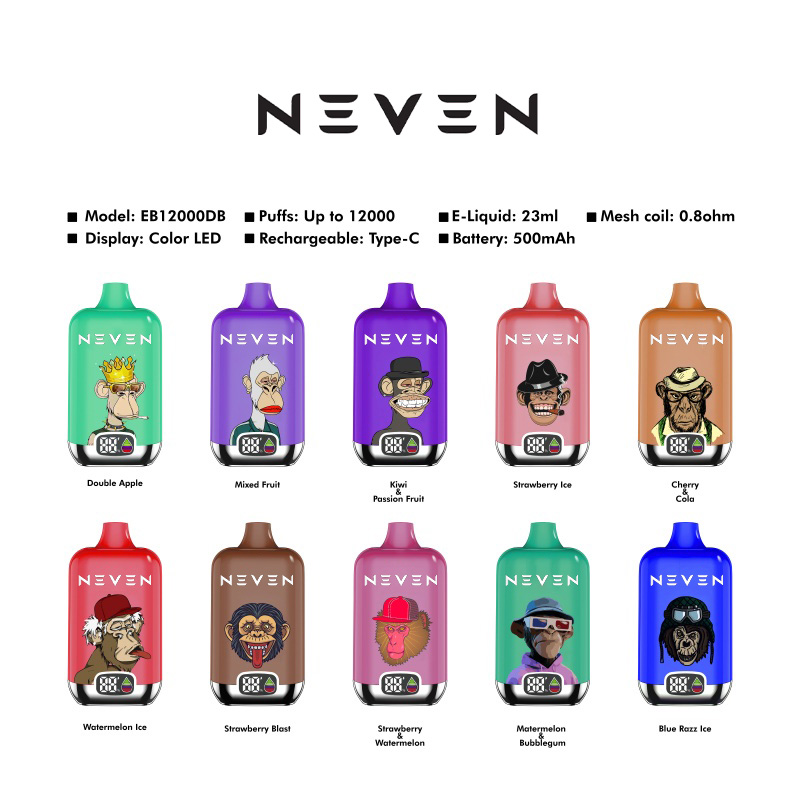 The NEVEN 12000DB is a smart digital disposable vape that combines stunning design with unparalleled performance. Boasting a sleek box shape, curved corners, and a sleek chrome metal base, this vape is a true head-turner. The vibrant LED display adds a touch of modern flare, while the monkey expressions and cartoon patterns on the surface amplify its cool quotient. Prefilled with 23ml of e liquid for up to 12000 satisfying puffs, it’s powered by a mesh coil with 0.8ohm resistance for massive vapor production and an enhanced vaping sensation. The built- in 550mAh rechargeable battery charges via a convenient Type-C port, ensuring you never miss a beat. Choose from 10 well crafted flavors and enjoy.