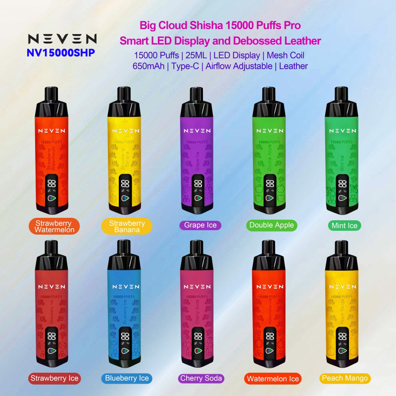 The NEVEN shisha15000 puffs pro NEVEN 15000SHP is a disposable vape that embodies the essence of a shisha experience. This premium device boasts a substantial 25ml e-liquid capacity, delivering an impressive 15000 puffs for extended use and unbeatable value. Powered by a 650mAh rechargeable battery with a Type-C charging port, it ensures every last drop of e-liquid is enjoyed. The NEVEN 15000SHP’s leather-wrapped body exudes luxury, featuring stitching-like accents and debossed patterns that vary by flavor. Its ergonomic design, combining a cylindrical shape with squared-off ends and a rounded mouthpiece, offers a comfortable and authentic shisha feel. A vibrant LED display adds a touch of modernity, displaying e-liquid and battery levels for hassle-free usage. With a 0.6 ohm resistance mesh coil, it produces massive clouds, enhancing the flavor profile. An adjustable airflow dial at the base allows for personalized draws, perfect for Direct-to-Lung (DTL) vaping just like shisha. Choose from 10 exquisitely crafted flavors, made with food-grade ingredients for the freshest, most natural taste.